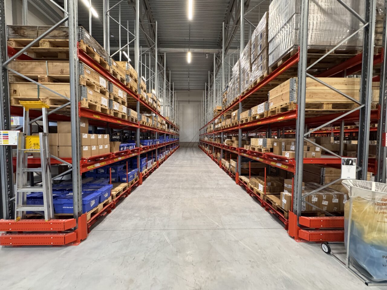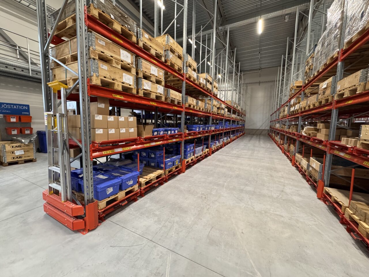 Till Rudhäll Industris nya lager på Bredasten i Värnamo, har vi fått förtroendet att leverera och montera lagerinredning. I leveransen ingår Pallställ Omega, kompletterat med bland annat stolpskydd, genomföringsskydd samt en större mängd utdragsenheter för snabbt och enkelt plock från pall. Vi har även levererat EAB hyllställ för de minsta artikelvolymerna.